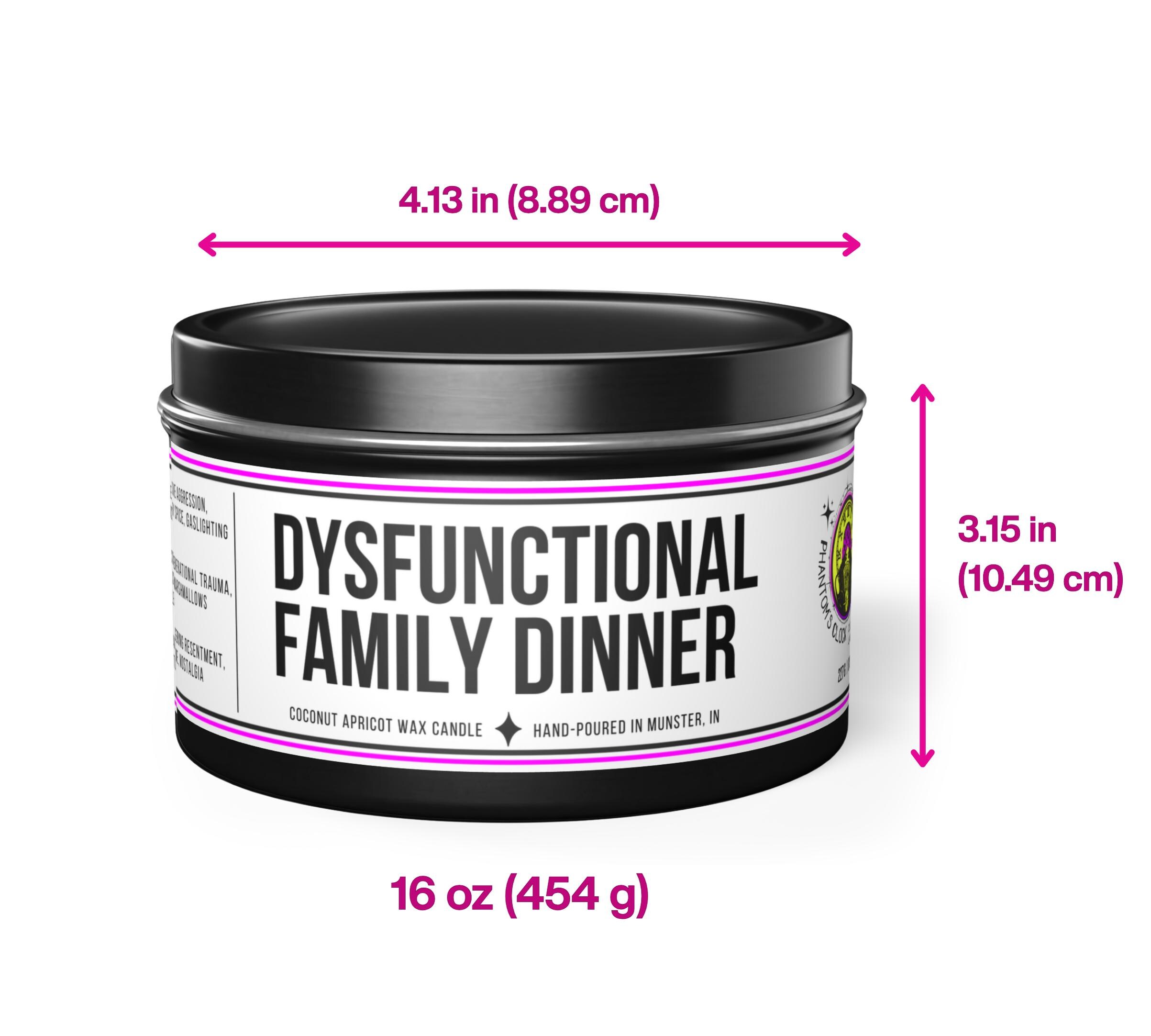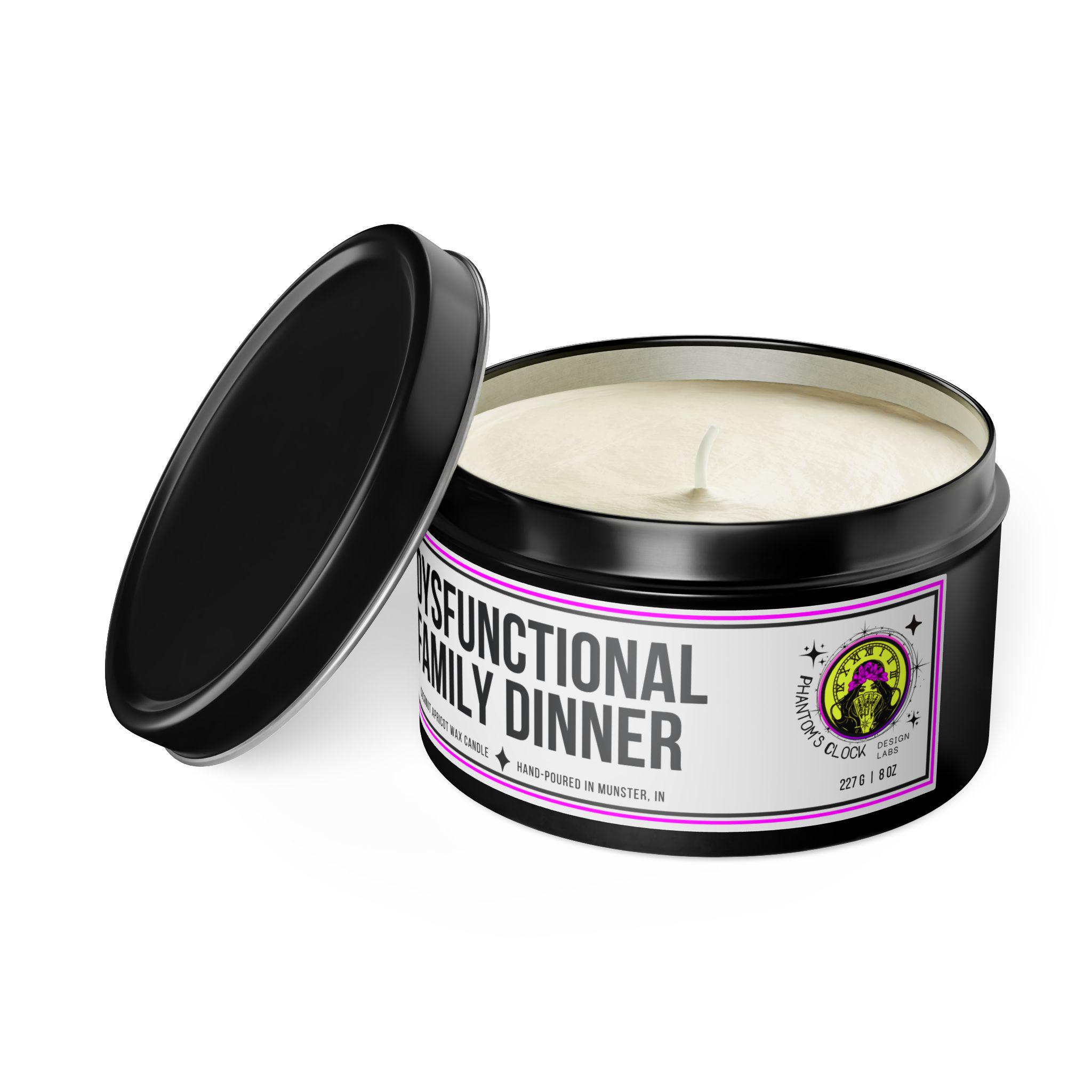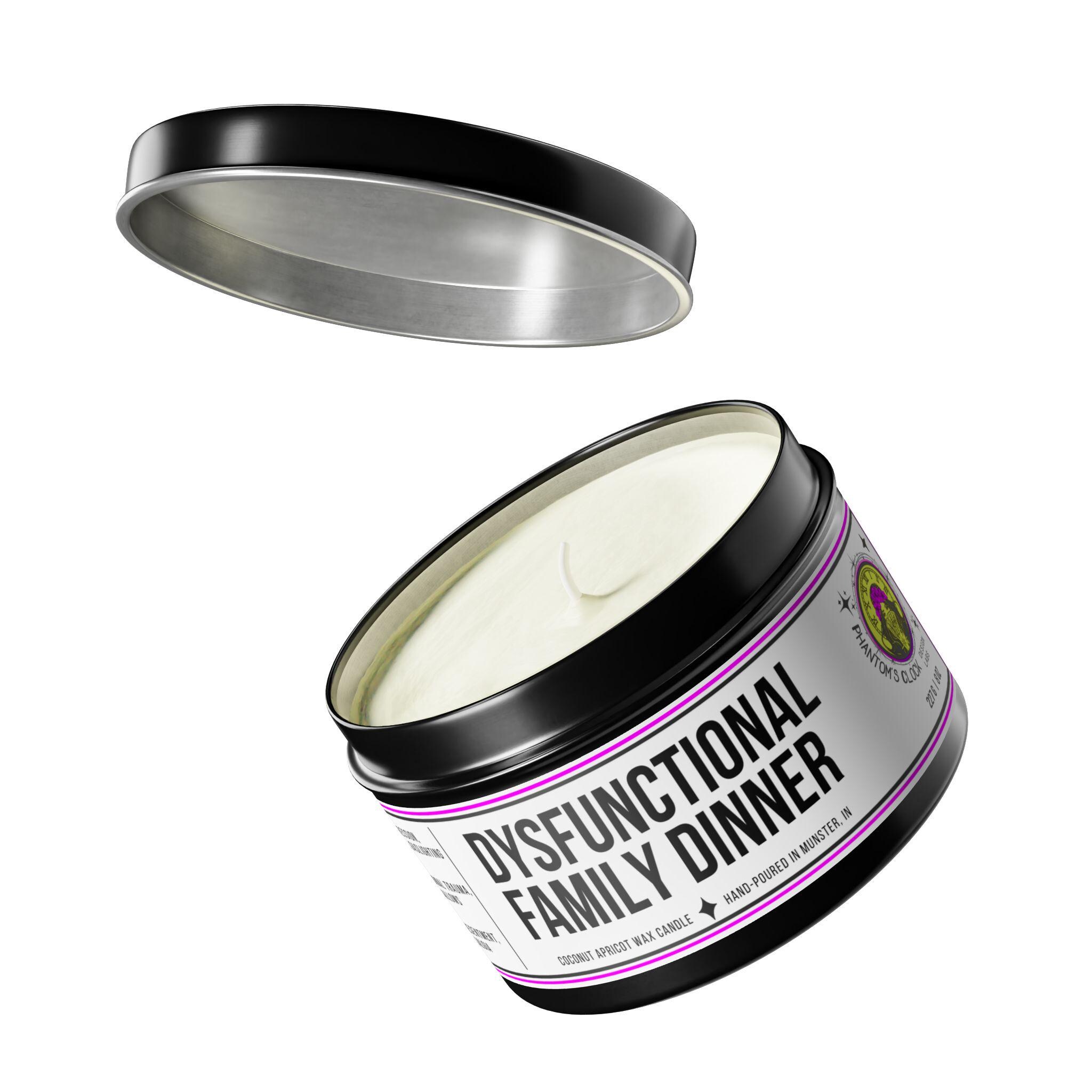 Funny Scented Candle | Dysfunctional Family Dinner 8oz & 16oz Eco-Friendly Coconut Soy Wax, Reusable Tin, Hand-Poured in USA, Long Burn Time