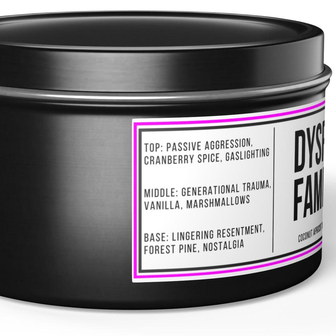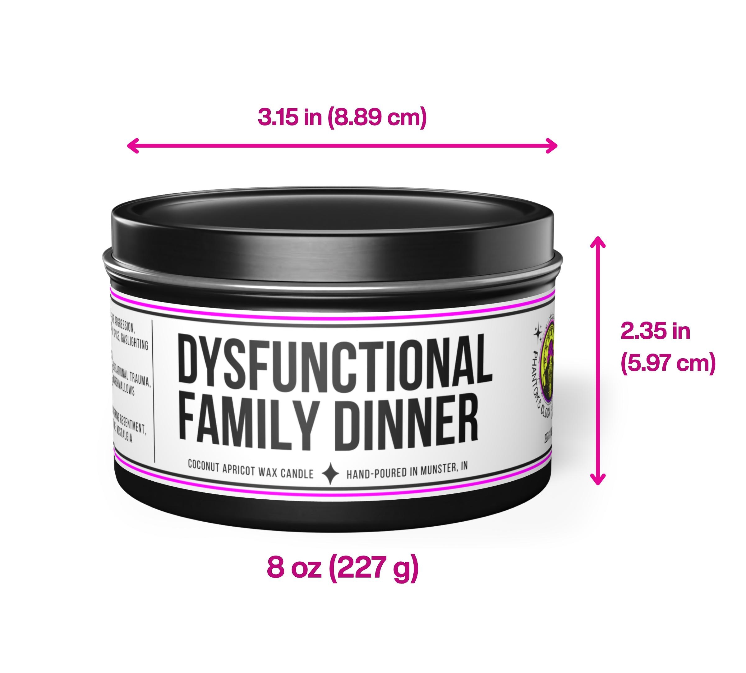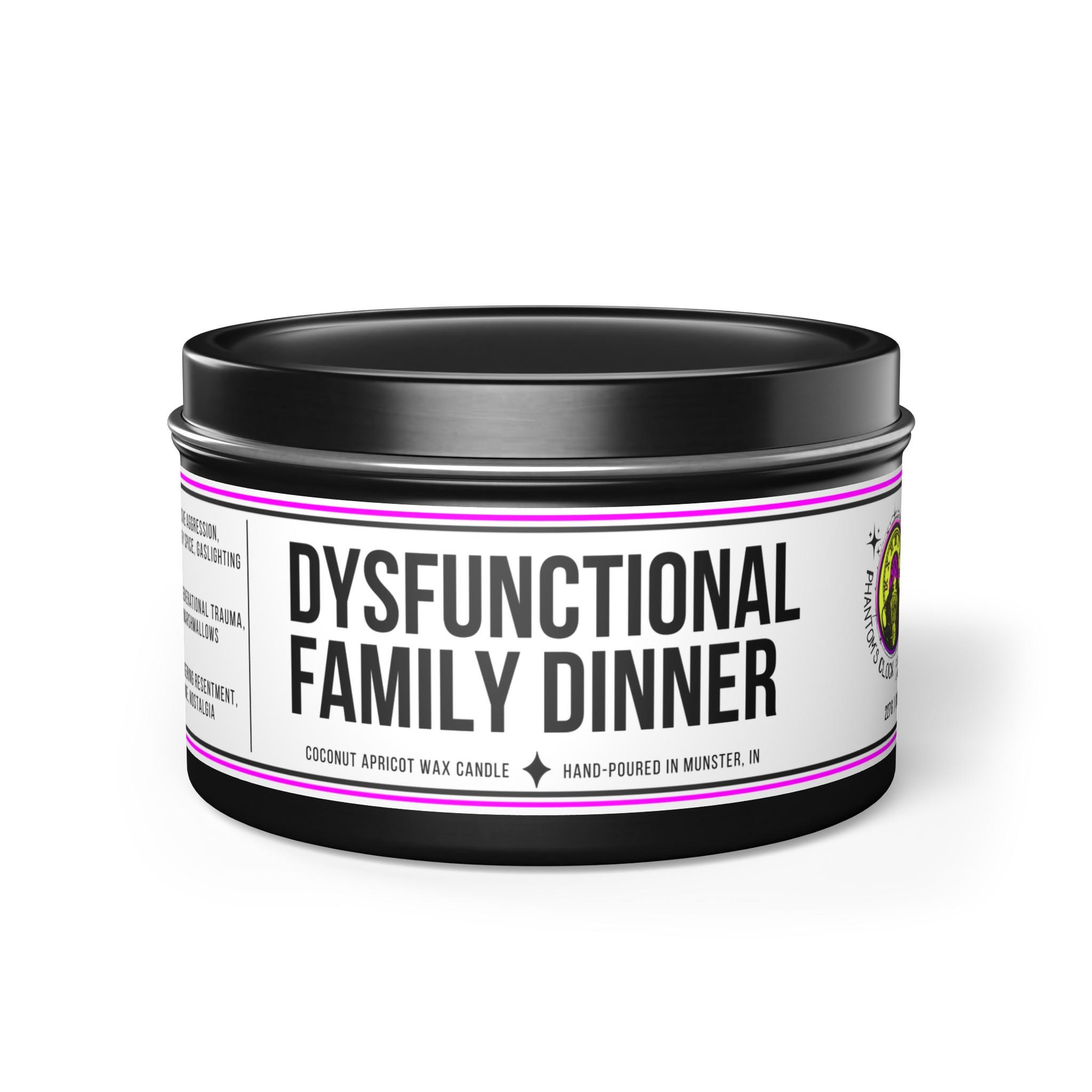 Funny Scented Candle | Dysfunctional Family Dinner 8oz & 16oz Eco-Friendly Coconut Soy Wax, Reusable Tin, Hand-Poured in USA, Long Burn Time